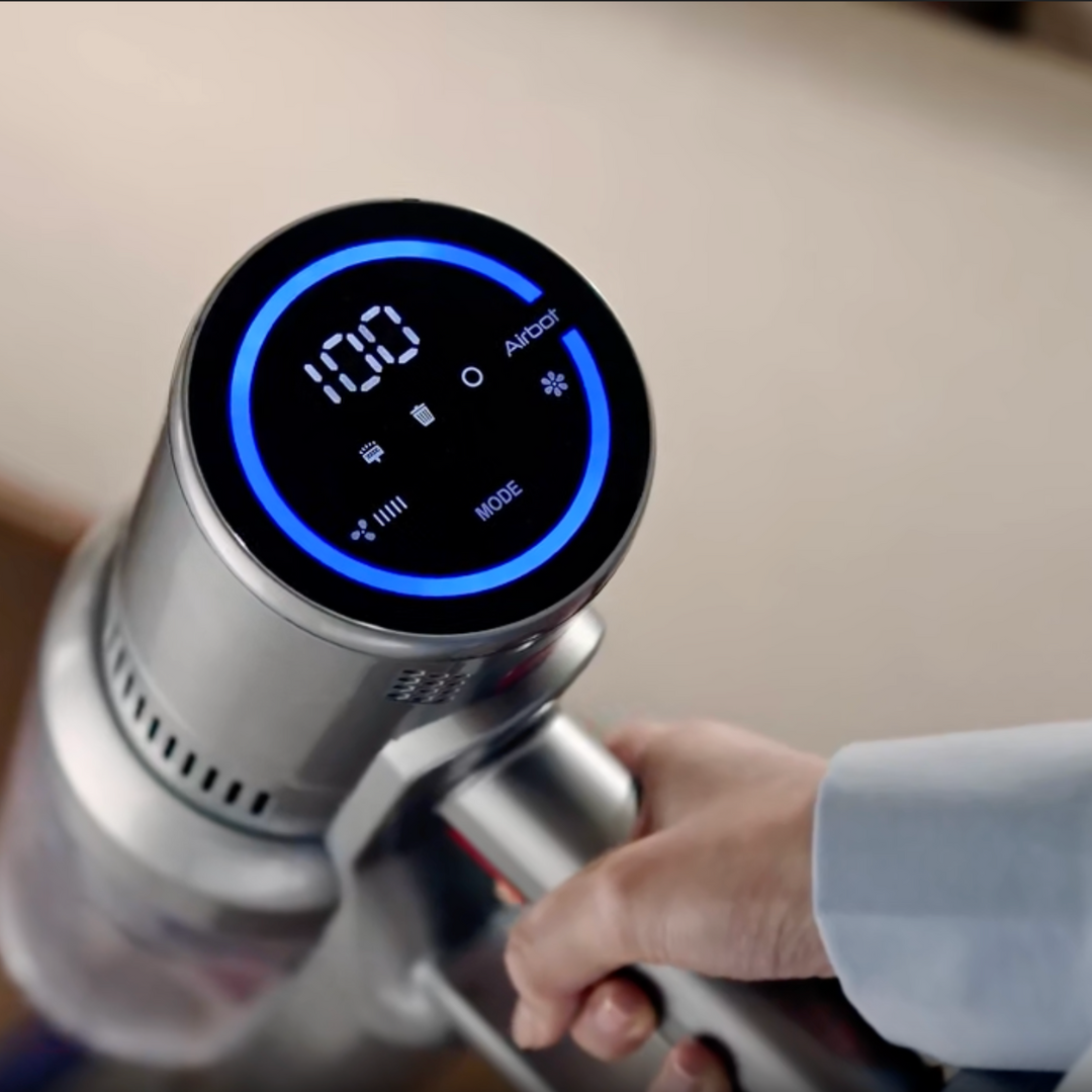 Skift tilstande med et tryk og få tydelig status på batteri og rengøring – uden gætteri.